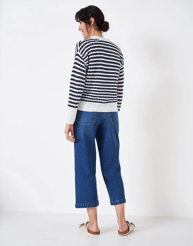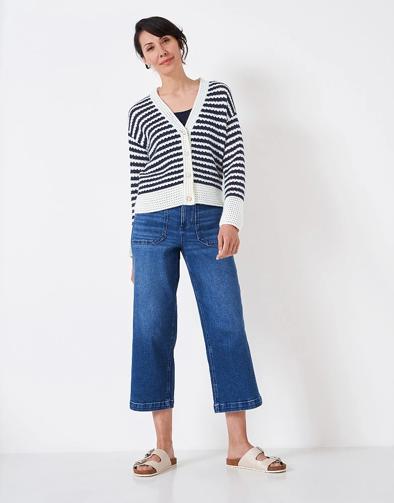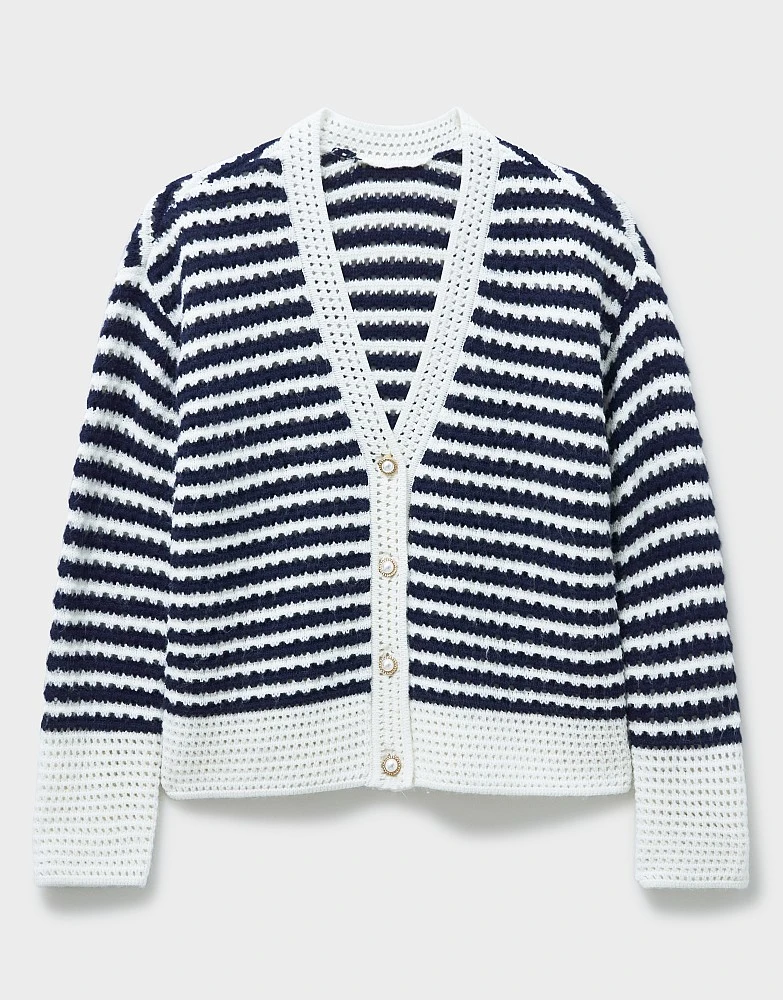 Say hello to our pointelle cardigan in navy and white stripe. Soon to be your favourite knit, this cardigan features mock pearl buttons and an all-over stitched pattern. We like it paired with jeans or draped over a dress. Effortless.