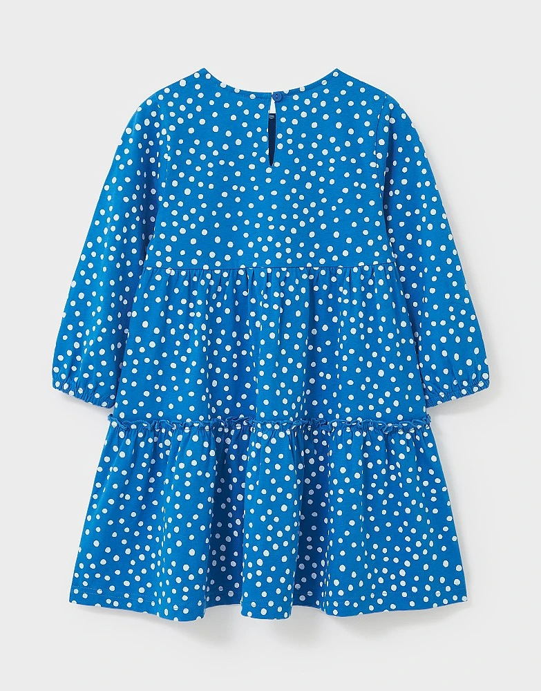 A polka dot dress in blue and white. This features long sleeves, a colourful design and tiered details that little ones will love. Pair with white leggings for an easy 30-second outfit.