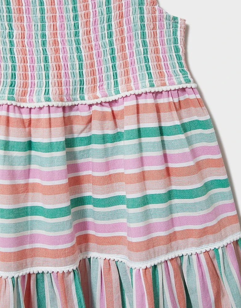 A multicoloured stripe dress. The perfect little wardrobe addition for the summer months – this sundress features frilly strap sleeves, an elasticated front placket and floaty tiers, all detailed with white pom poms. So fun and oh-so-cute, she’ll love wearing this on play dates and beach trips alike. Just add sandals and a cardigan for when it gets chilly.