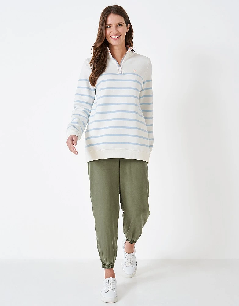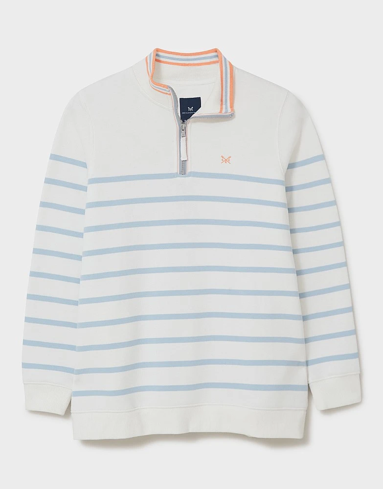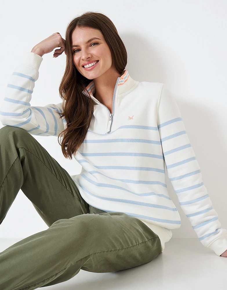 Our relaxed half zip sweatshirt in white with pale blue stripes. From contrasting coral touches, the cosy funnel collar to the fabric that’s been washed for softness, we’ve thought about it all with this piece.