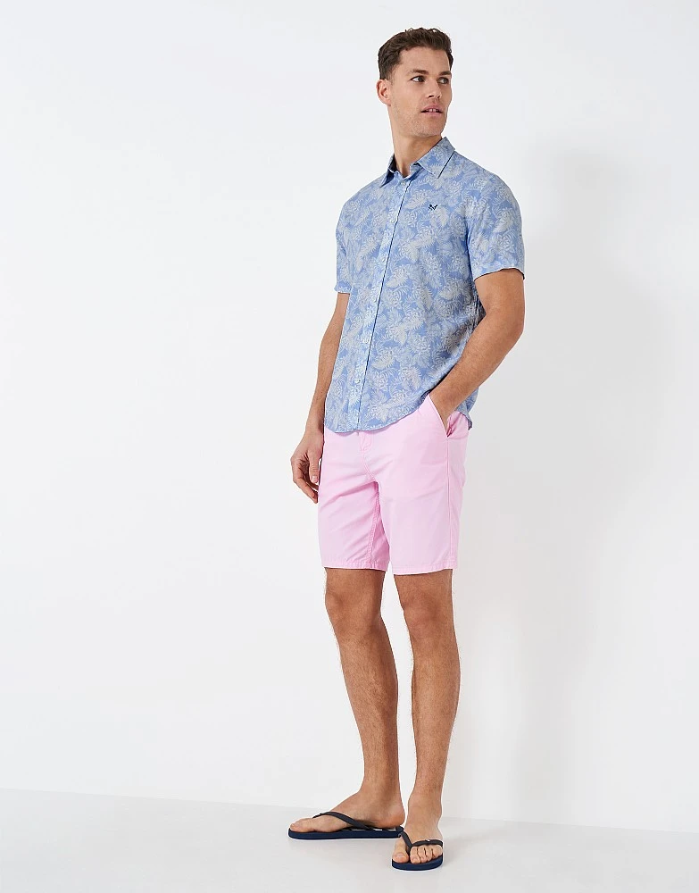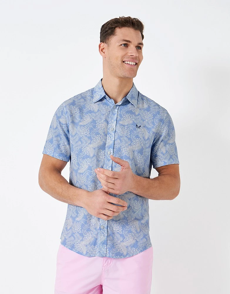 A blue, short sleeve linen blend shirt in a leaf print. The perfect partner to chinos or shorts, this is a clear winner for warmer days. It’s smart but will keep you cool.