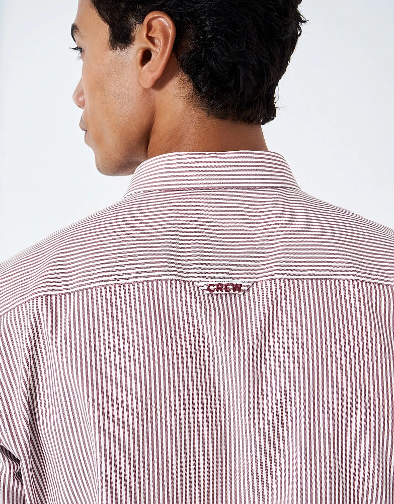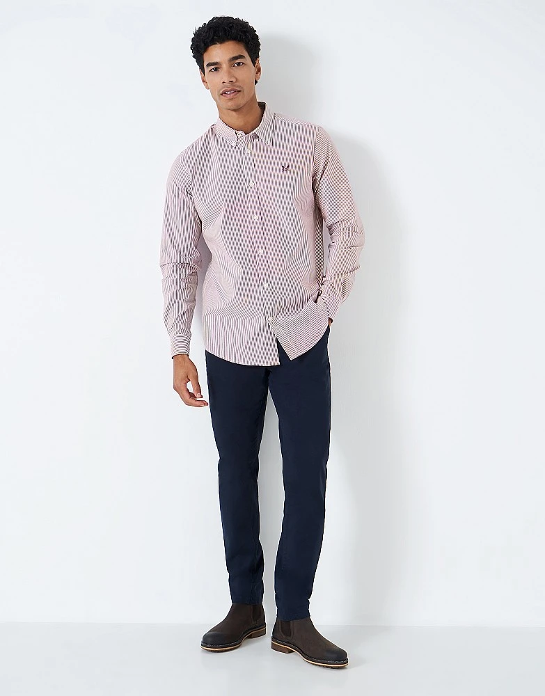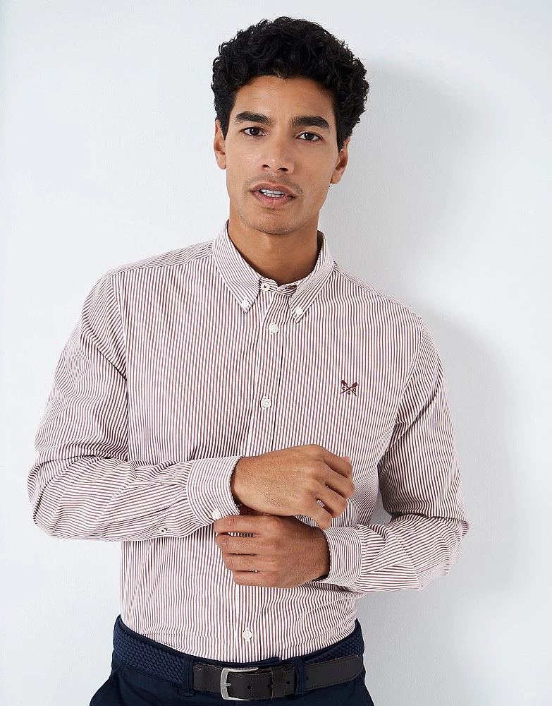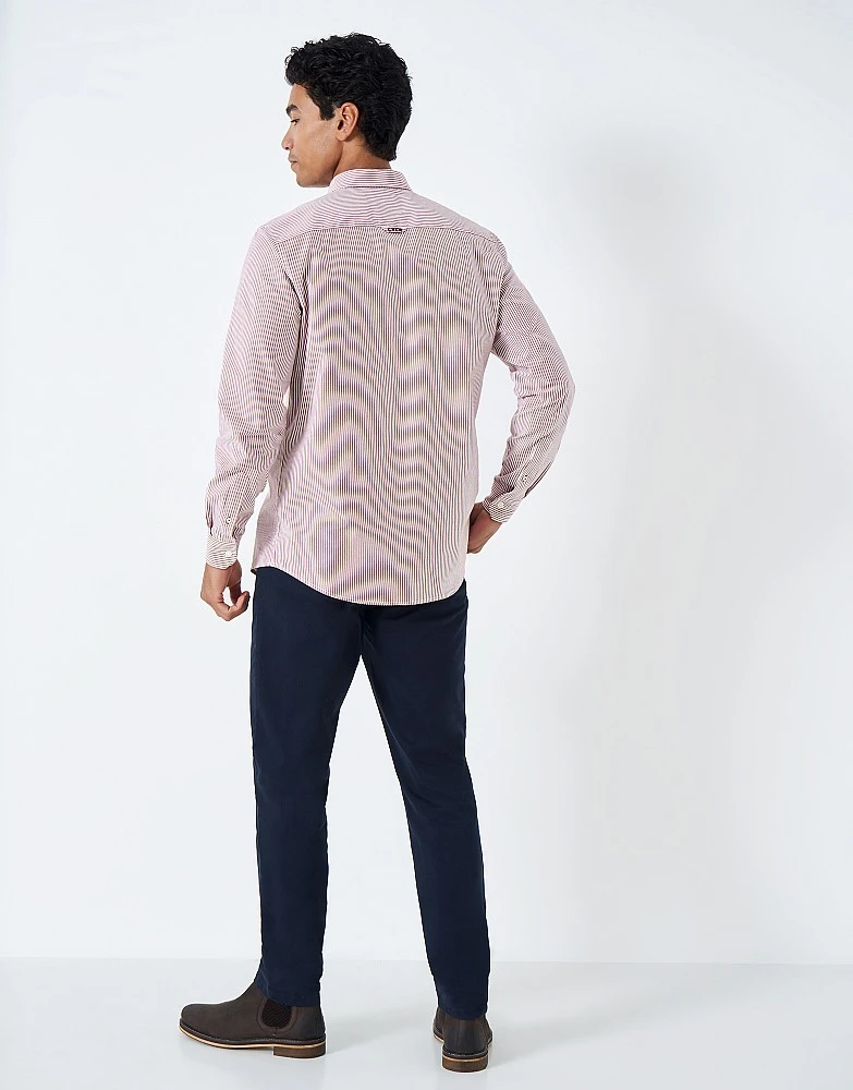 A striped shirt in burgundy and white. Designed with natural stretch, this everyday essential has our crossed oars stitched on the chest for the perfect finishing touch. Wear with chinos and brogues for a classic look.