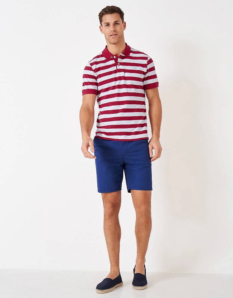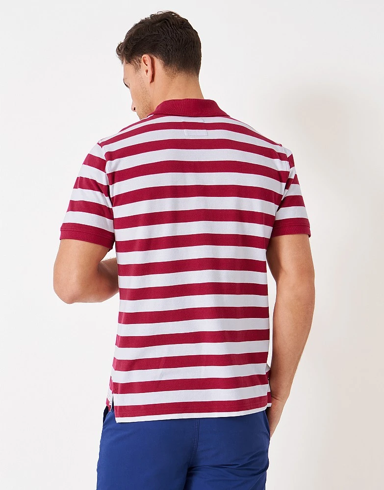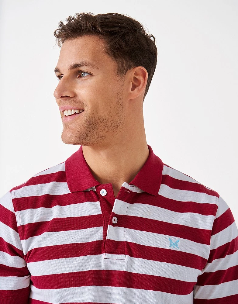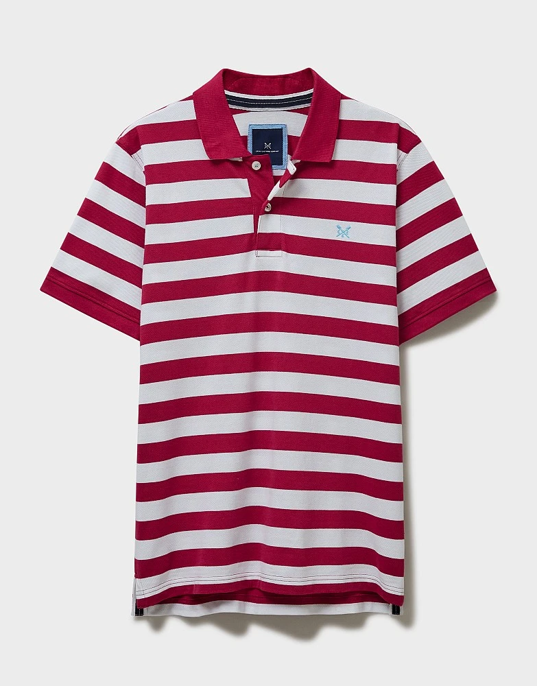 A dark pink and red striped polo. This classic style is cut from 100% cotton and features our contrast crossed oars on the chest, along with hidden embroidery under the collar. Wear with chinos for a smart casual look. A staple as we move into spring.