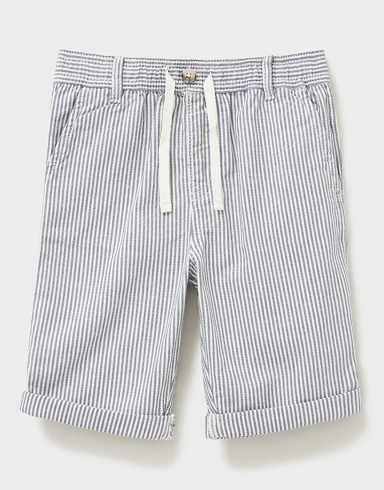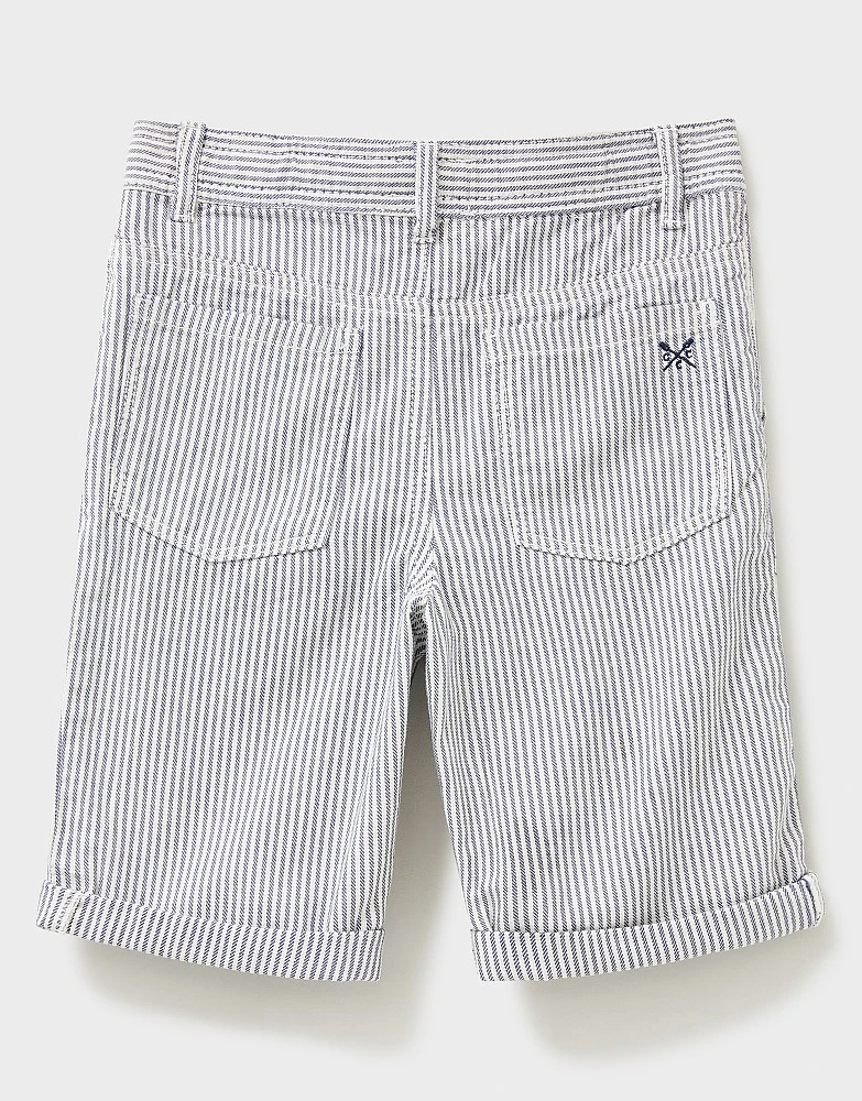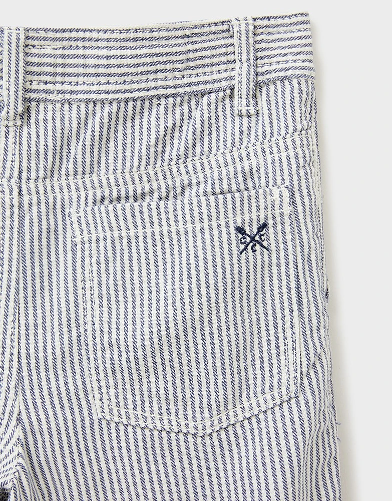 Boys’ blue and white striped shorts. These features handy pockets to stash treasures and an adjustable waist. Perfect for all their summer adventures.