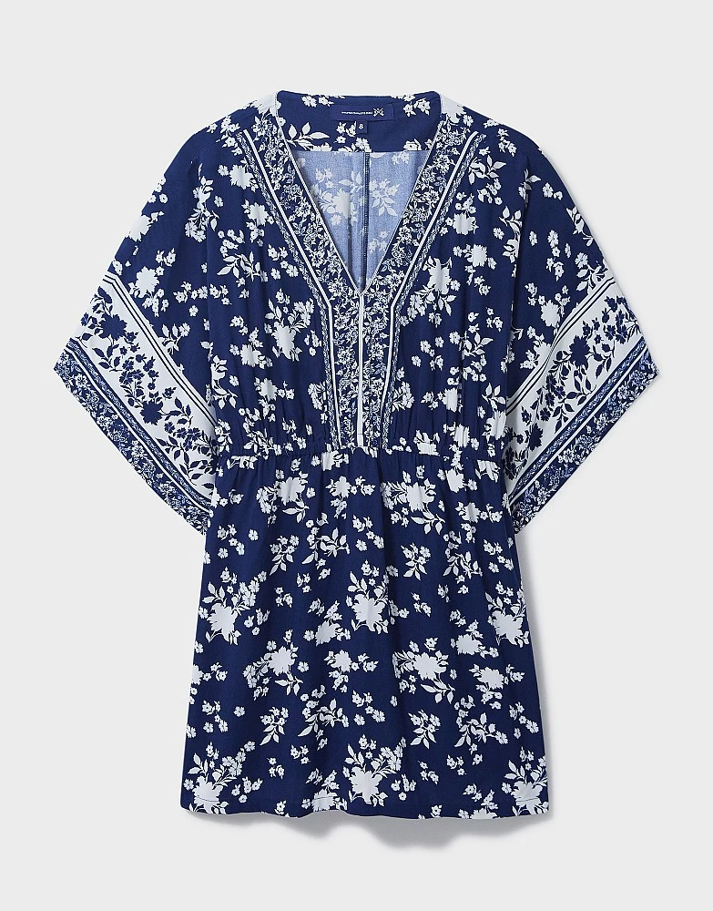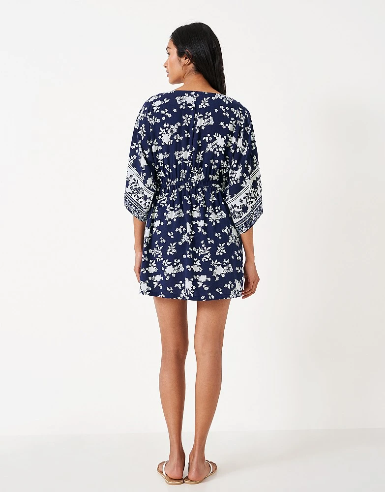 Our Ulla beach dress in navy and white. Featuring a flattering v-neckline, elasticated waist and loose, floaty sleeves – this is the perfect dress to wear solo or as a cover-up. Layer over your favourite swimsuit and hit the beach in style.