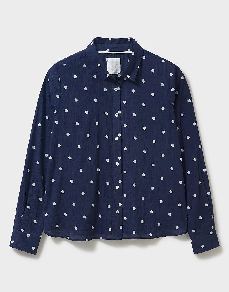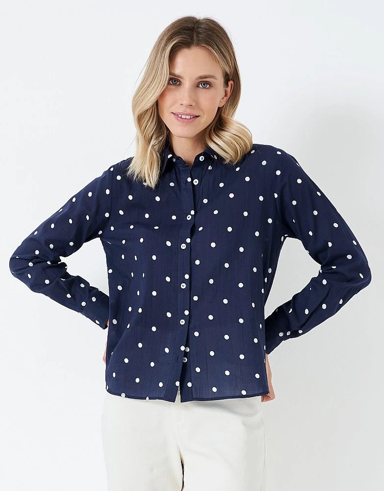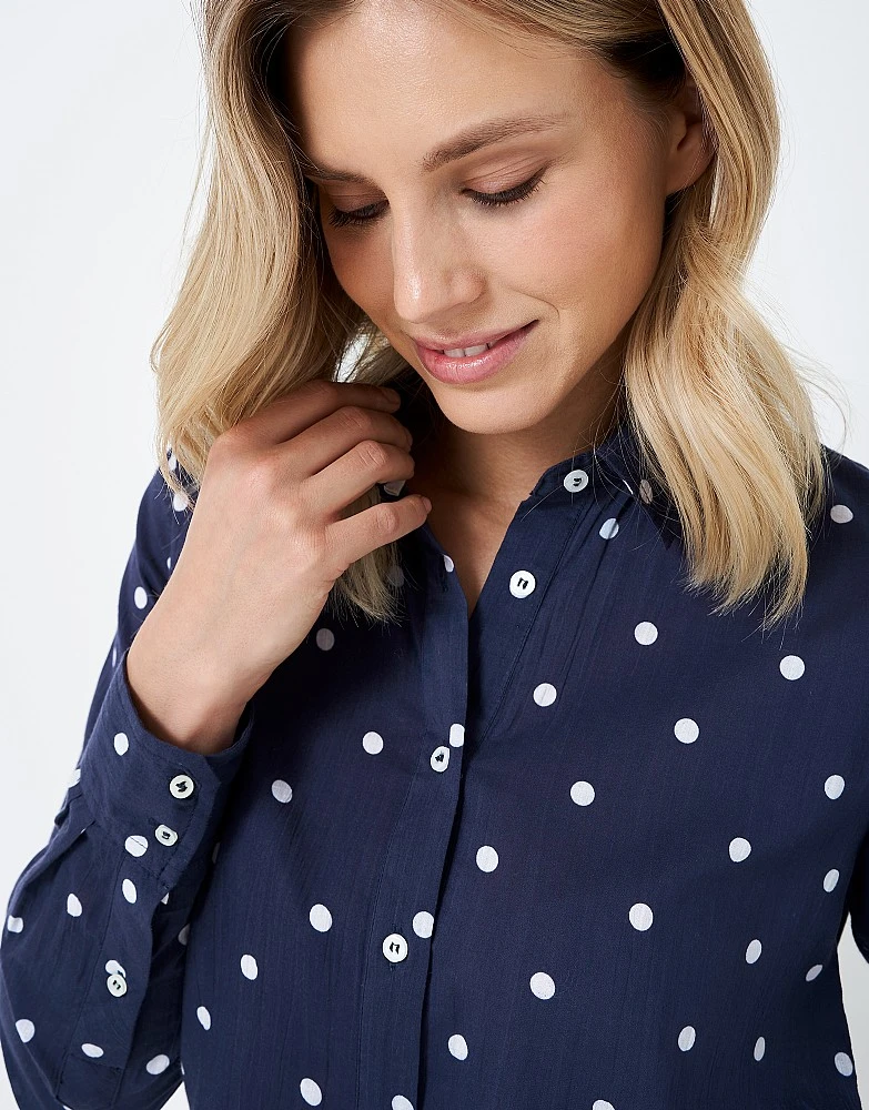 A navy and white spot shirt. This soft shirt has been expertly tailored for a feminine look and is perfect for layering under a jumper or tucking into jeans. The print is as pretty as a summer morning.