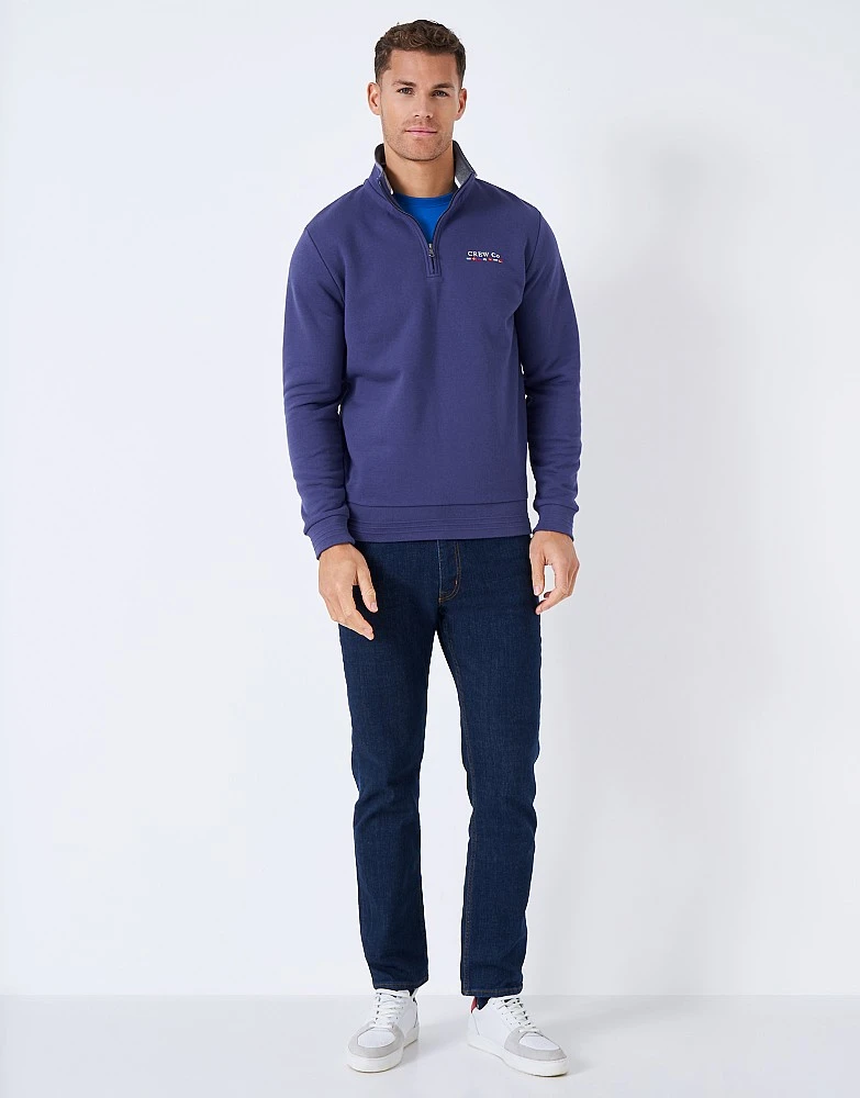 A half zip sweatshirt in blue. Super soft with a fitted shape that goes just as well with your smarter chinos as it does with your jeans. Our Crew branding on the chest has a varsity feel, and the ribbed detailing on the cuffs and hem is the perfect finishing touch. It’s the ultimate final layer.