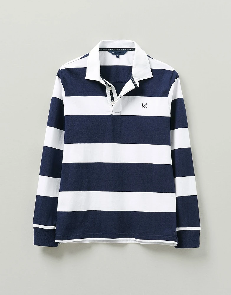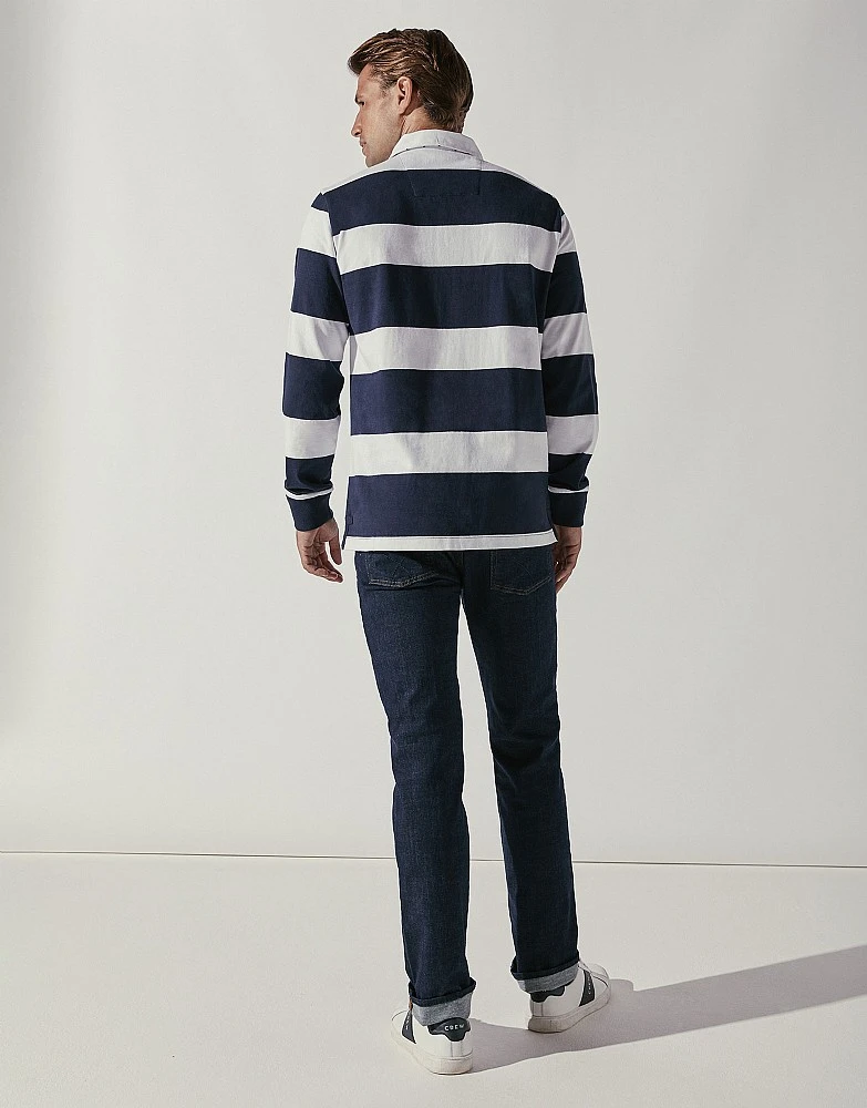 A navy and white striped rugby with a white twill collar. Pair with jeans and head out for the weekend. For on and off the pitch.